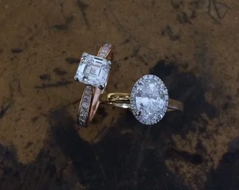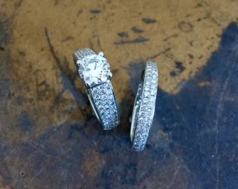 A timeless engagement and wedding band set. The diamonds are set in a honeycomb pattern....