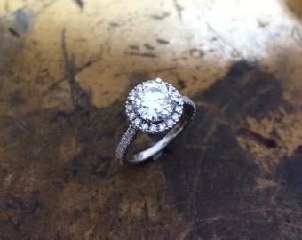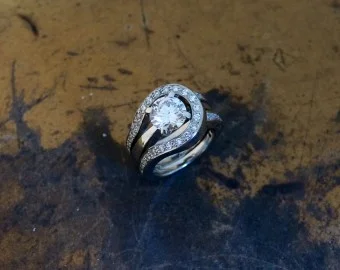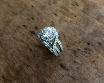 Stunning 19k Halo engagement ring, wrapped by its 1/2 moon shaped wedding band ....