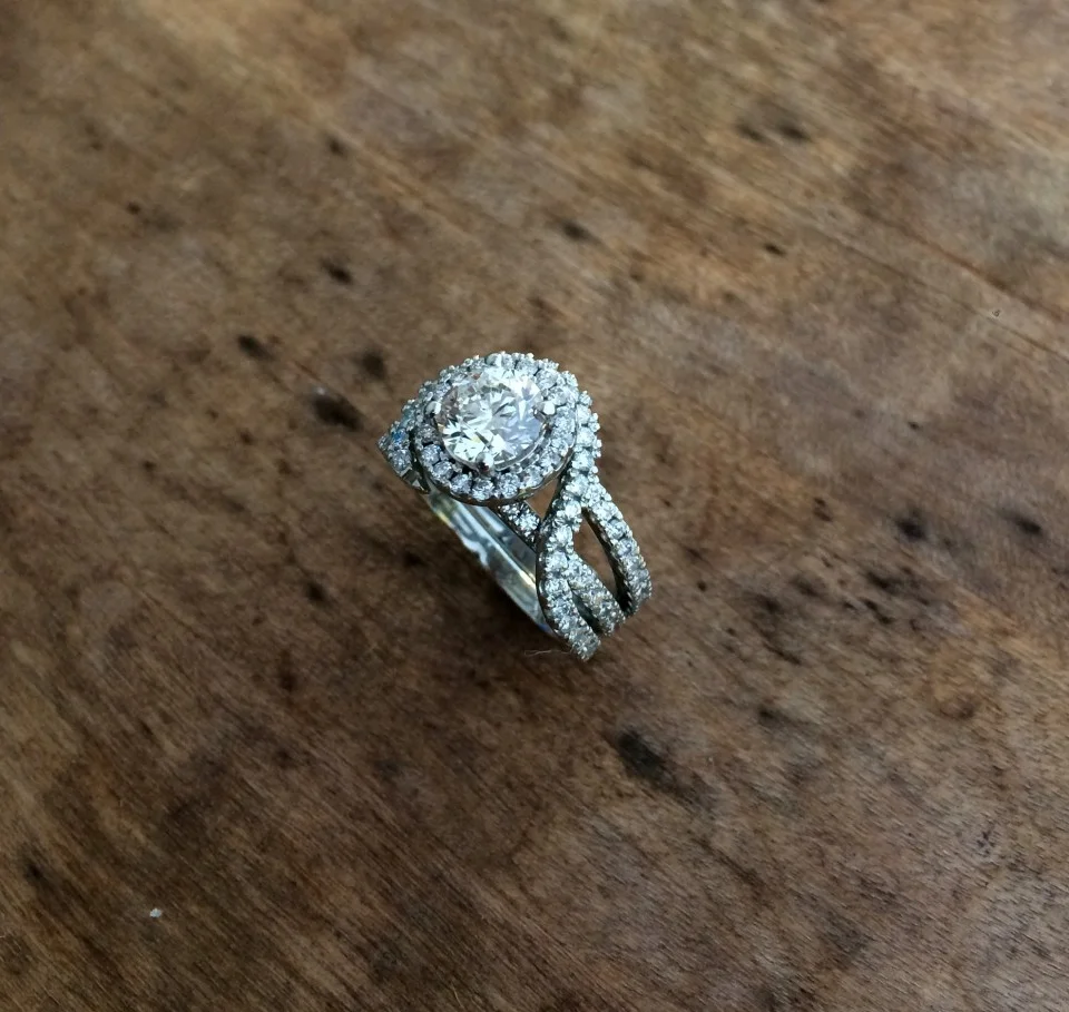 Stunning 19k Halo engagement ring, wrapped by its 1/2 moon shaped wedding band .